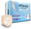 Attends Discreet Underwear is worn under clothing like regular underwear, they provide an alternative to briefs for more active individuals. This premium product is designed with a soft, cloth-like breathable fabric and full-belly elastic waistband for a comfortable, contoured fit. The advanced core materials have a high moisture capacity, channeling fluid and locking it away to keep the skin dry and healthy. With the added protection of barrier leg cuffs, Attends Discreet Underwear is recommended for moderate to heavy incontinence. Tear-away side panels make removal fast and easy.