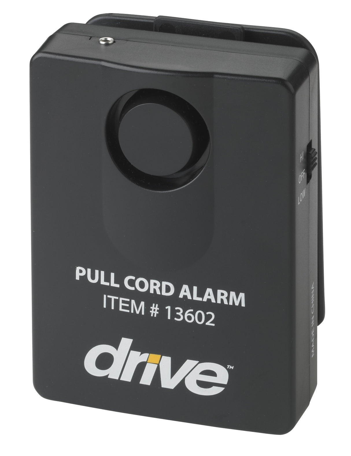 A more economical way to signal that a patient has moved, this deluxe pull-cord alarm easily secures to a bed or chair with a self-contained clip. It features a pin-style activation cord (adjustable from 18" to 36") that pulls when the user moves, dislodging the pin from the alarm unit and activating the signal. The alarm includes two volume settings (97 dB and 103 dB) and can be deactivated with the On/Off switch. The product requires one 9V battery to operate (included).