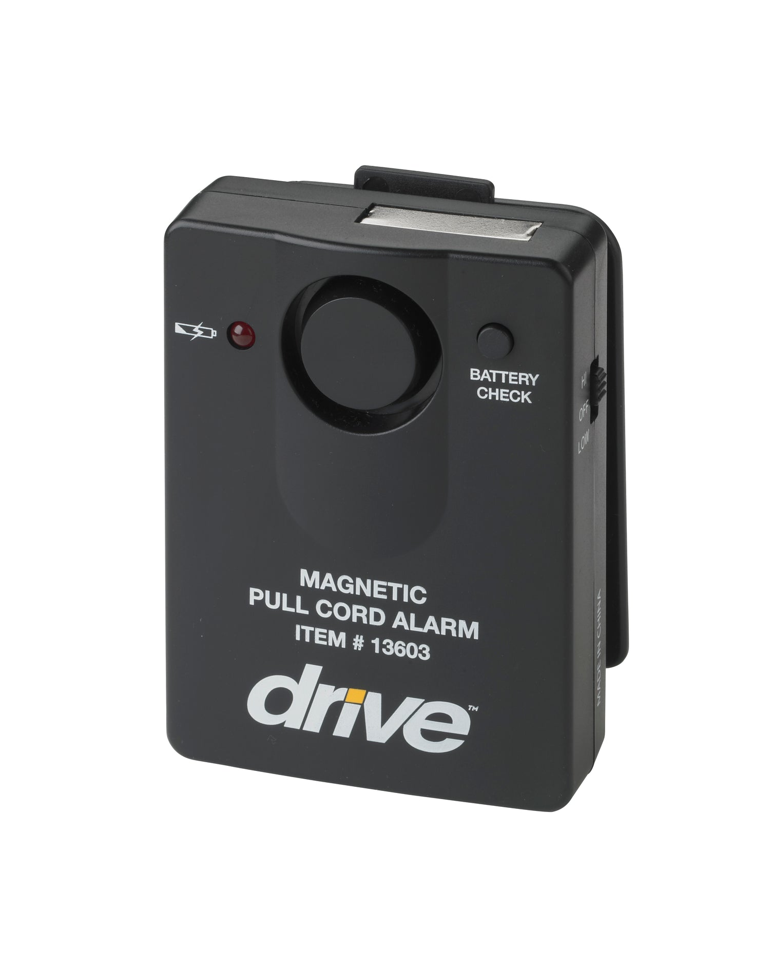 Once the magnetic pull-switch is removed, the alarm sounds on this tamper-proof pull-cord alarm by Drive Medical. The pull-switch, which includes a convenient On/Off switch, activates from any direction and adapts to various situations with a cord that adjusts from 28" to 58". The unit mounts easily on a bed or wheelchair - even on a patient's clothes thanks to an alligator clip. Volume adjusts from 97 to 103 dB on the alarm, which requires one 9V battery (included).