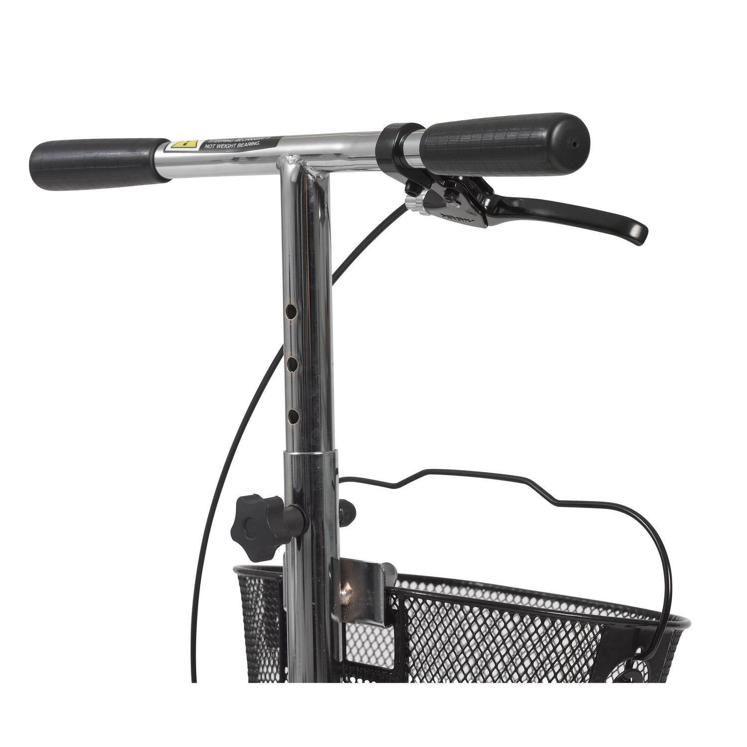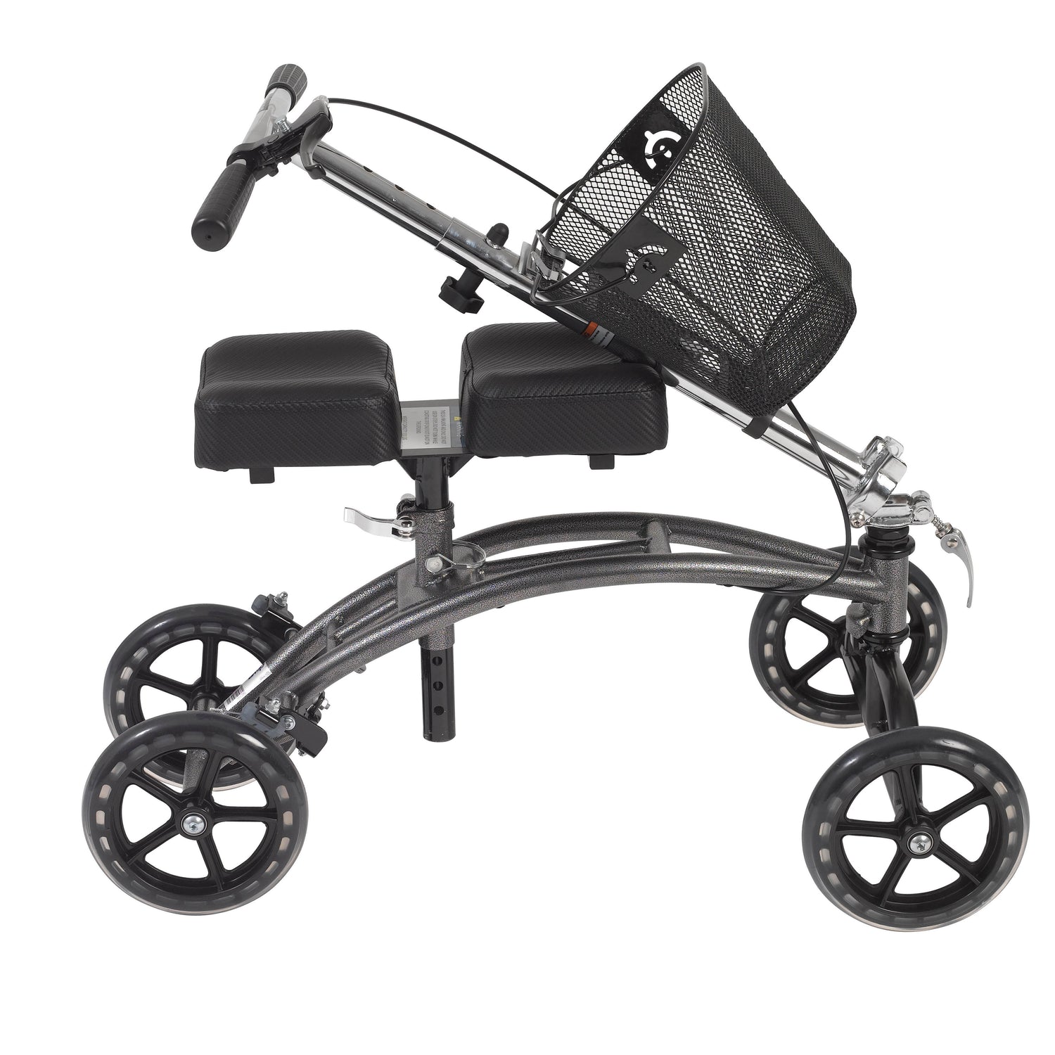 For those experiencing pain or discomfort following foot surgery, breaks, sprains or ulcers, the Dual Pad Steerable Knee Walker with Basket from Drive is a simple, comfortable, durable, and pain-free crutch alternative. Unlike other knee walkers that offer only forward-facing front wheels, Drive's Steerable Knee Walker features a fully maneuverable pair of front wheels for superior ease of use. Plus, the new two-piece leg pad provides superior user comfort. Tool-free height and left/right leg adjustments let users tailor the Knee Walker to their specific needs. The unit's 8" wheels make it ideal for indoor and outdoor use and the deluxe dual braking system helps maximize safety. The Dual Pad Steerable Knee Walker with Basket provides quicker mobility and enhanced safety and stability over crutches allowing you to better manage pain and recover more quickly.