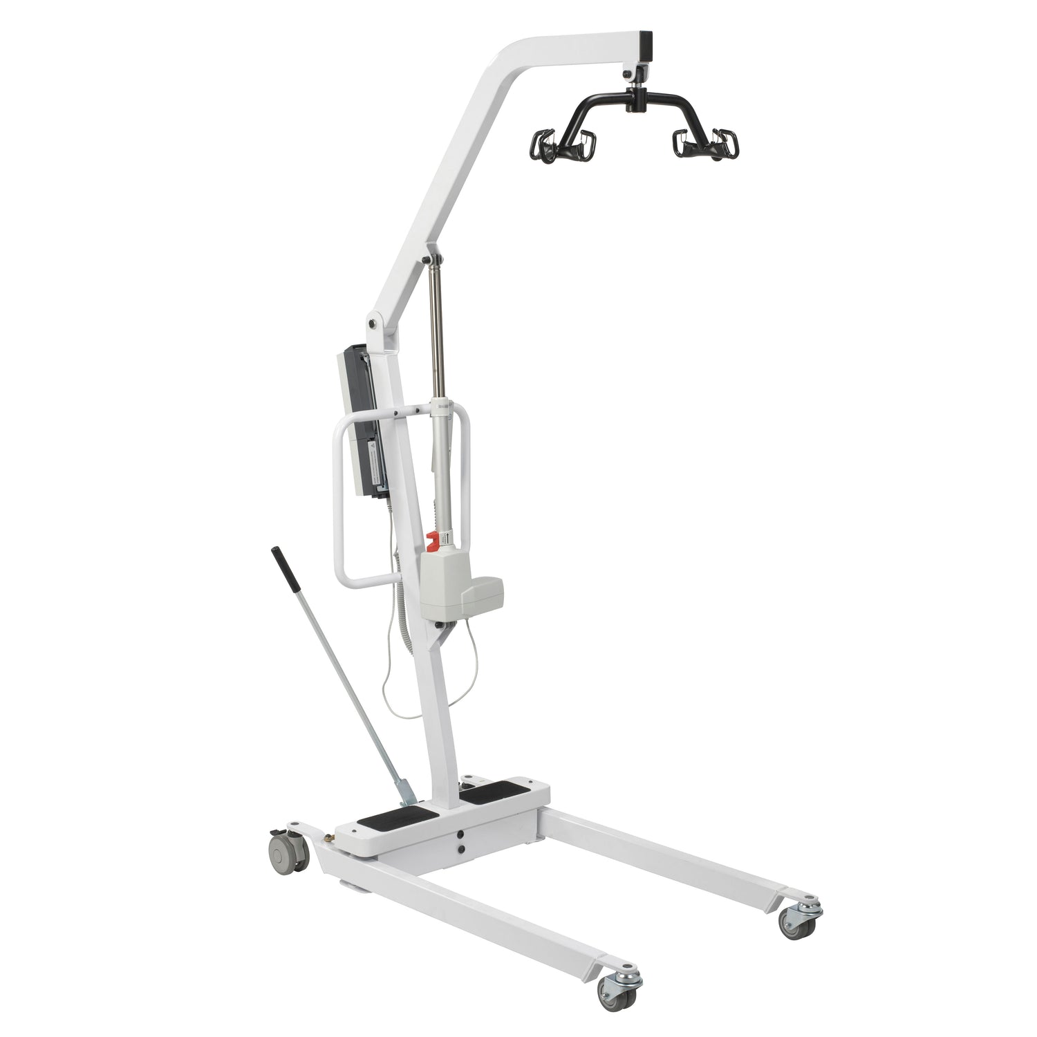 Ce lève-personne électrique de Drive Medical se recharge rapidement et facilement sur une prise secteur grâce à une batterie rechargeable (amovible) pratique. La batterie se recharge en branchant l'appareil et ne nécessite aucun retrait. (L'appareil ne fonctionne pas lorsqu'il est branché.) Sa construction robuste et sa pompe à vérin géante qui abaisse le patient garantissent un repositionnement en toute sécurité. La pompe est même équipée d'un bouton d'urgence et peut être commutée en mode manuel. Deux fonctionnalités vous garantissent une autonomie optimale : un signal sonore vous avertit lorsque la batterie tombe en dessous de 50 % et un voyant « CHARGE » s'éteint automatiquement lorsque la batterie est complètement chargée. L'appareil est équipé d'un mât pliable et d'une base large et stable pour un rangement et un transport faciles, ce qui le rend idéal pour les soins à domicile. Il est compatible avec les harnais à 4 et 2 points.